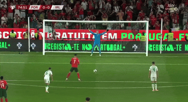 Ronaldo đã khép lại 1 ngày thi đấu vô cùng tệ hại bằng pha sút hỏng phạt đền ở phút 75. Trong tình huống này, ngôi sao thuộc biên chế Al-Nassr dứt điểm vào giữa khung thành, đưa bóng trúng chân thủ môn Kelleher, bỏ lỡ cơ hội mở tỉ số cho Bồ Đào Nha.