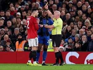 Các CĐV Man Utd khá bức xúc khi tiền đạo Antoine Semenyo chỉ phải nhận thẻ vàng sau pha túm cổ Diogo Dalot. |