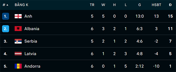 Toàn thắng 5 trận, ĐT Anh đang dẫn đầu bảng K với 15 điểm trọn vẹn, hơn 4 điểm so với đội xếp thứ 2 (Albania). Do Serbia bất ngờ để thua Albania ở loạt trận rạng sáng nay nên thầy trò Thomas Tuchel có thể định đoạt tấm vé sớm ngay ở lượt trận tới.