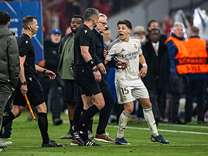 Tiền vệ Arda Güler đã bị phạt thẻ đỏ vì phản ứng dữ dội với trọng tài sau trận Real Madrid thua Bayern Munich ở lượt về vòng tứ kết Champions League. |