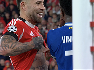Trung vệ Otamendi đã có hành động hài hước nhằm chọc tức Vinicius trong trận đấu giữa Benfica và Real Madrid tại Champions League. |
