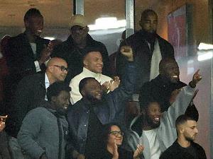 Trên khán đài, Kylian Mbappe cười phớ lớ sau khi cậu em trai Ethan ghi bàn vào lưới PSG. |